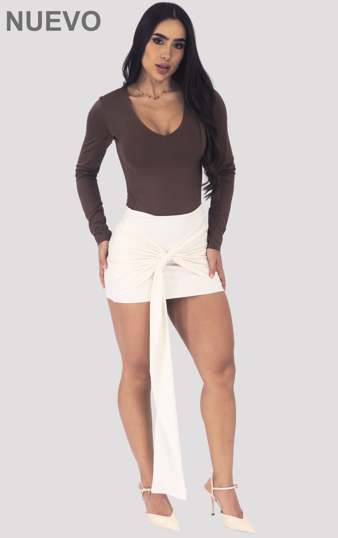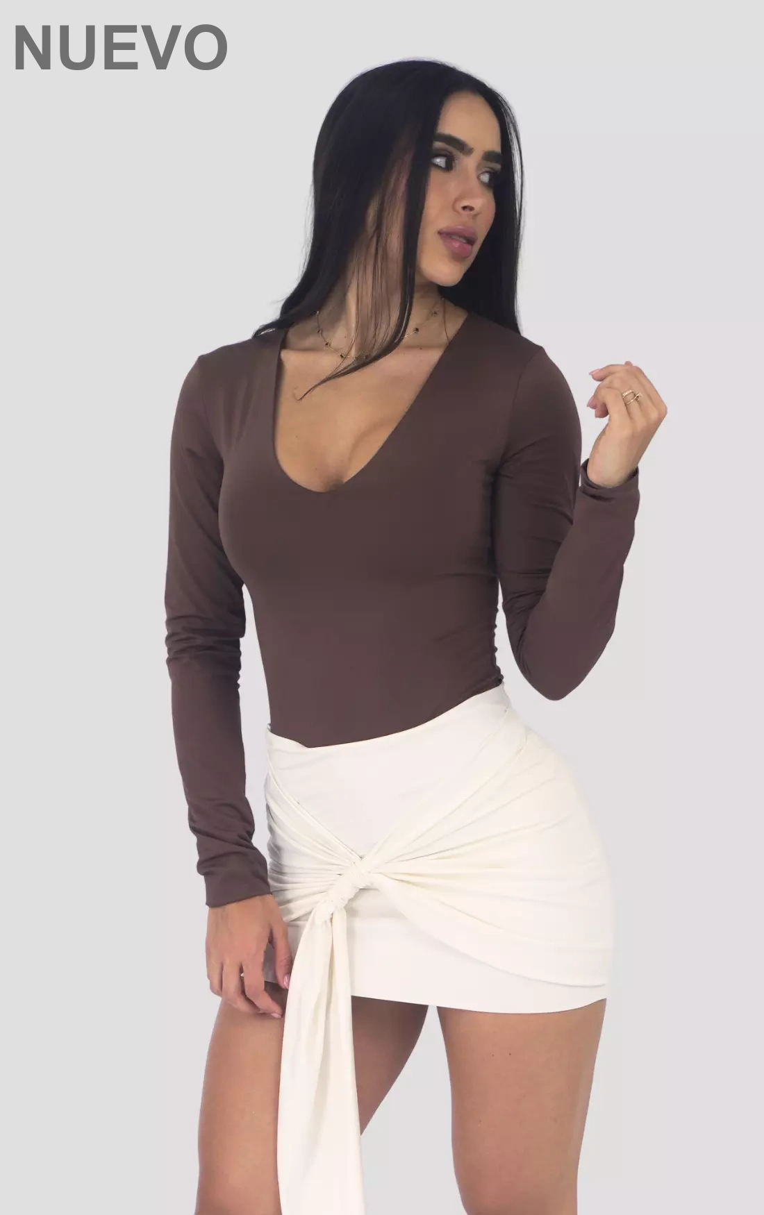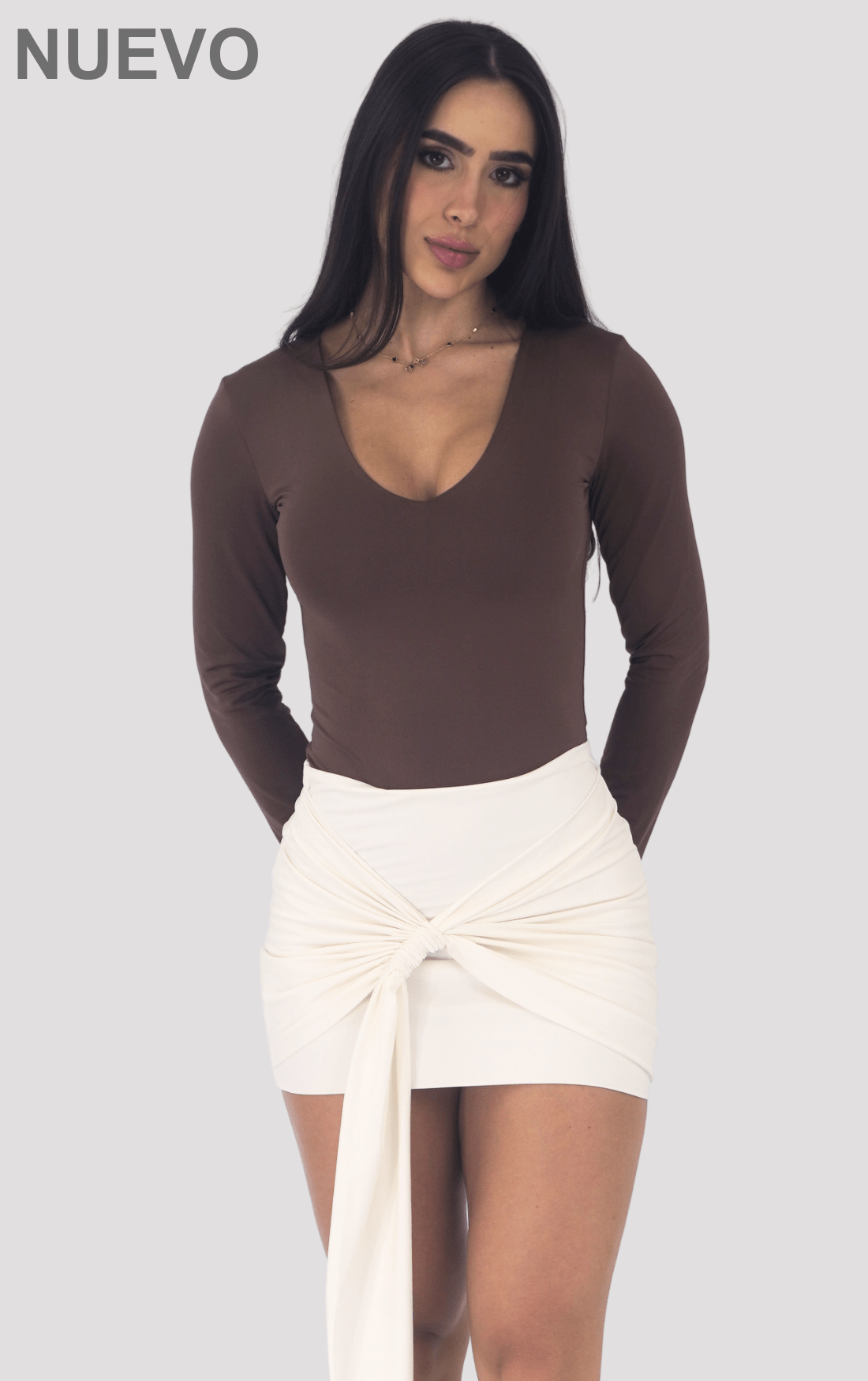 - Diseño: Body de manga larga con escote en “V” profundo.