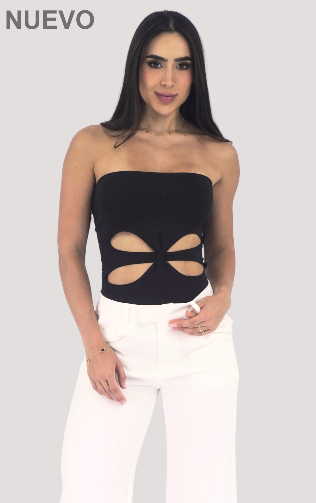 - Diseño: Body strapless con cortes frontales en diseño entrelazado y logo bordado en el busto.
