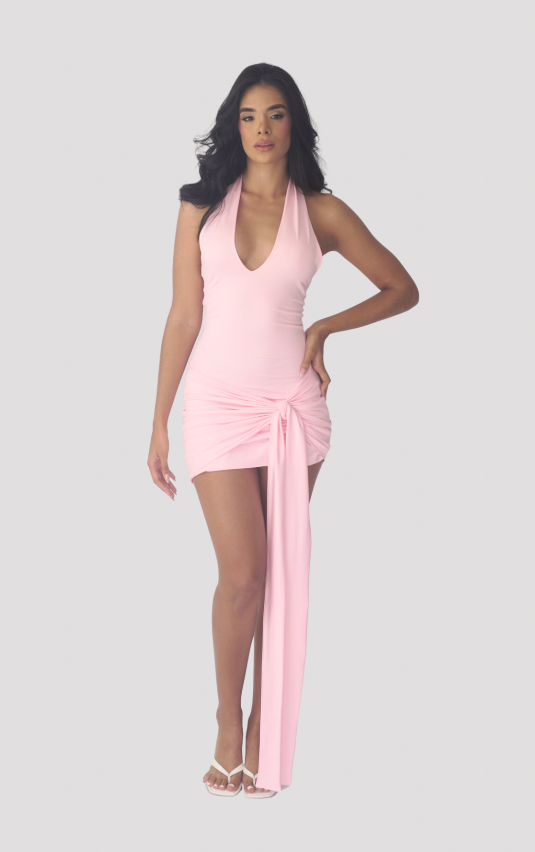 - Escote halter profundo y espalda descubierta