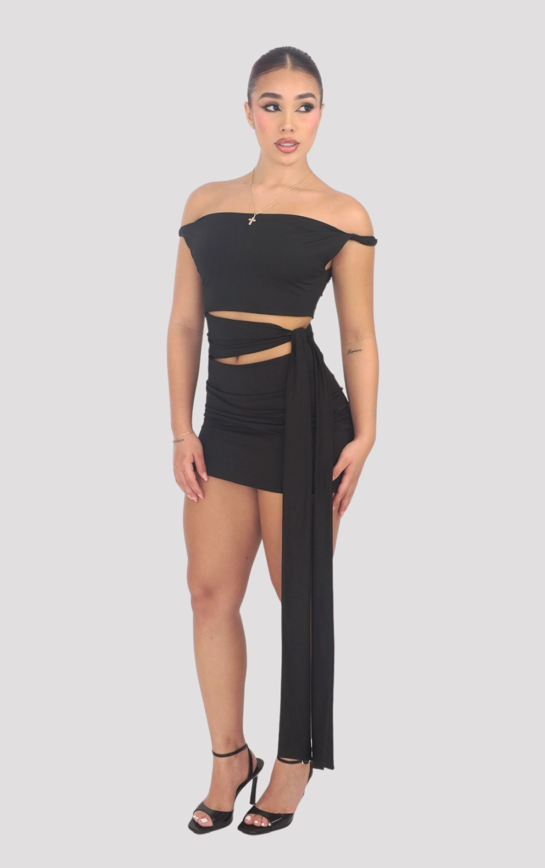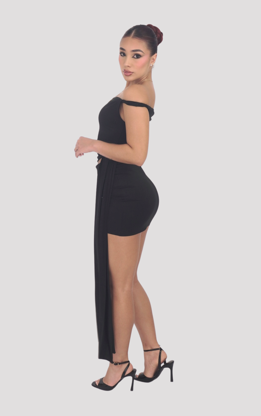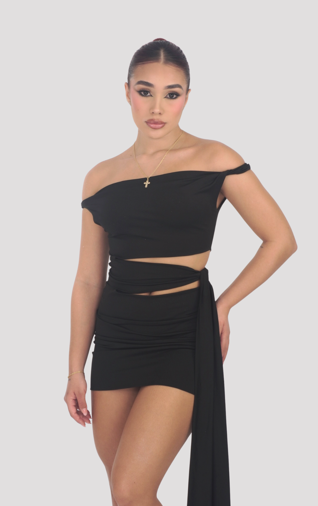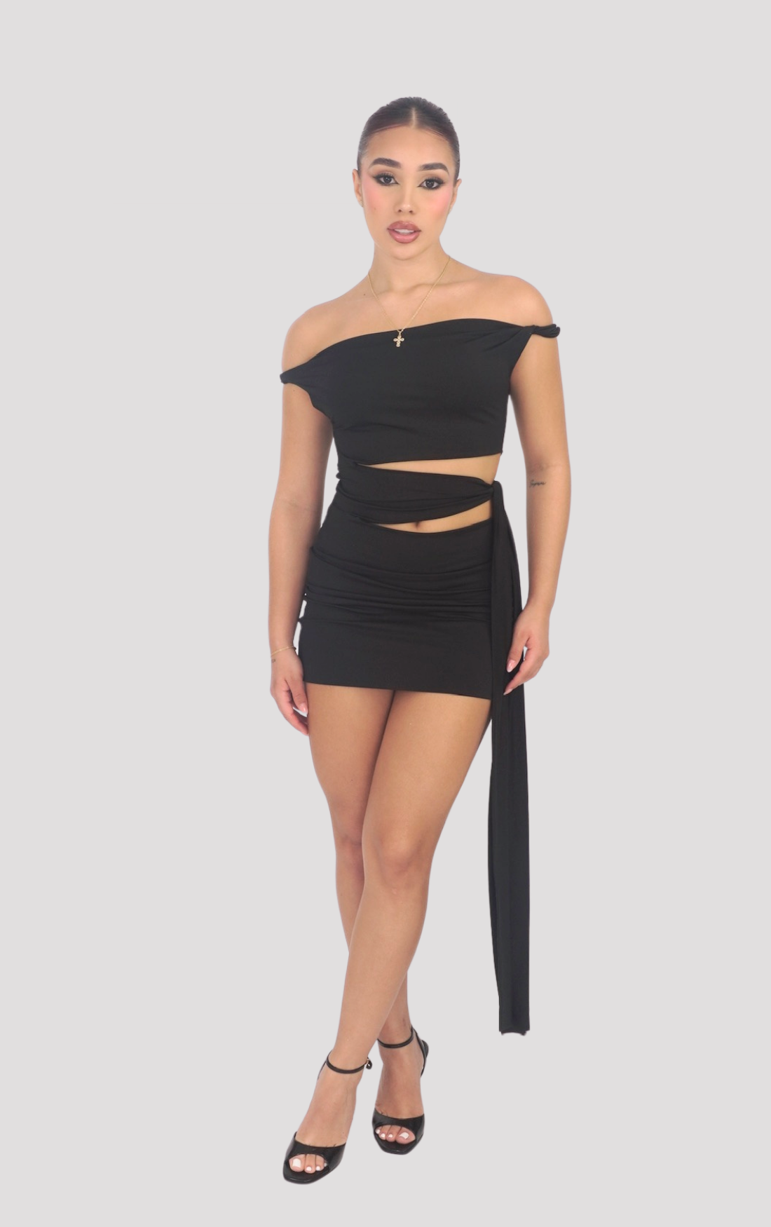 Destaca por su diseño tipo bandeja con hombros descubiertos, que enmarca el escote con sutileza y agrega un aire femenino y sensual. Su silueta ceñida realza las curvas, mientras que el fajón largo anudado a la cintura crea un punto focal visual que estiliza la figura y añade movimiento a la prenda. El diseño cut-out lateral en la cintura rompe con lo convencional, aportando originalidad y frescura.