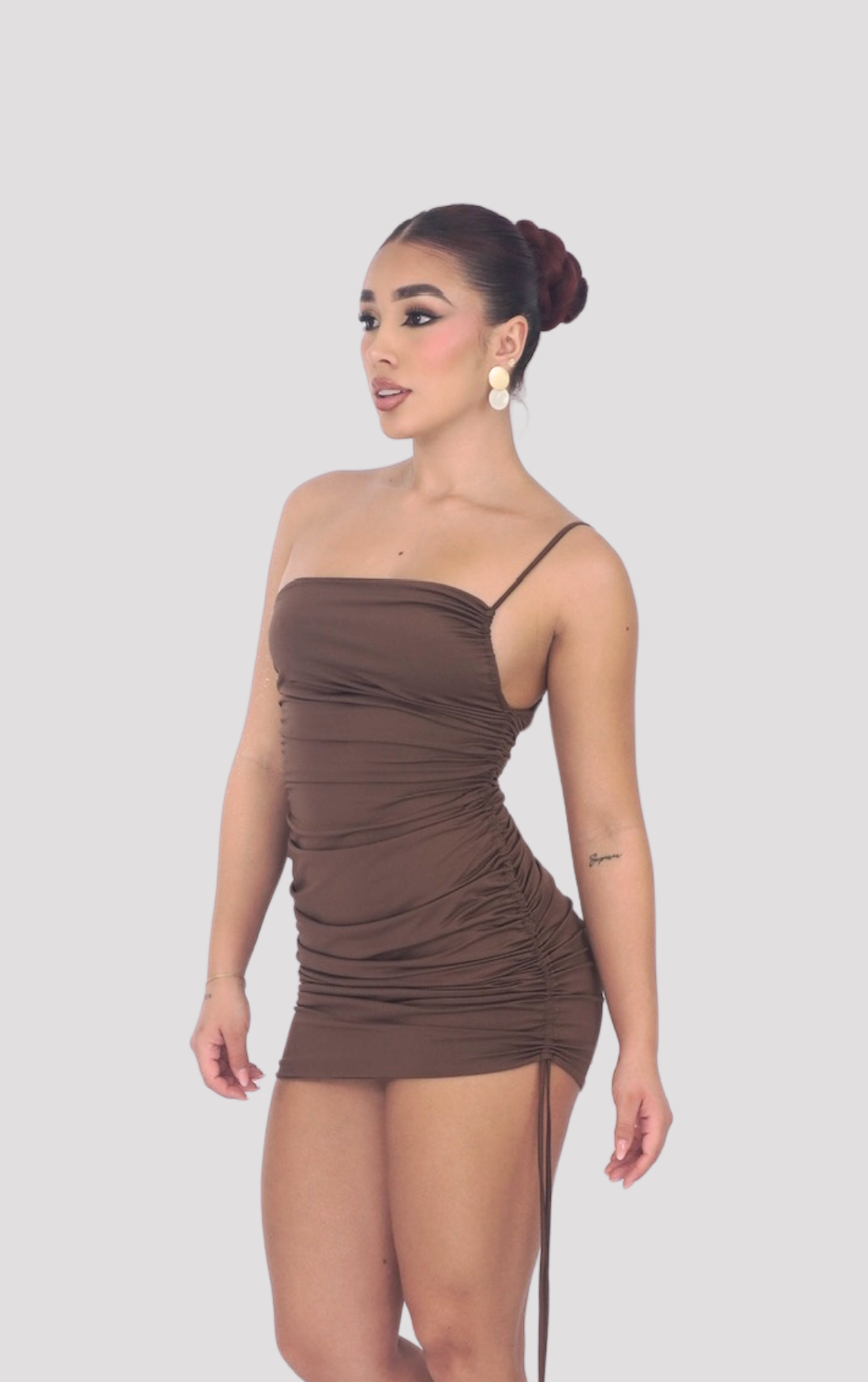 El Vestido Aurora es la definición de sensualidad en una silueta mini. Con tiras finas, escote recto y fruncido lateral ajustable, esta prenda está pensada para realzar la figura con un estilo atrevido, moderno y femenino. Su diseño se adapta al cuerpo brindando una apariencia estilizada y llamativa.
