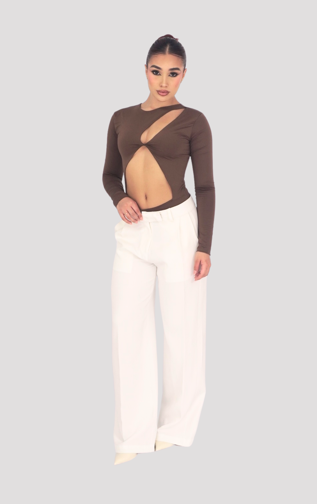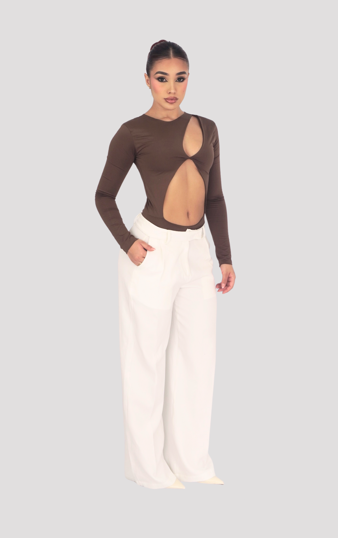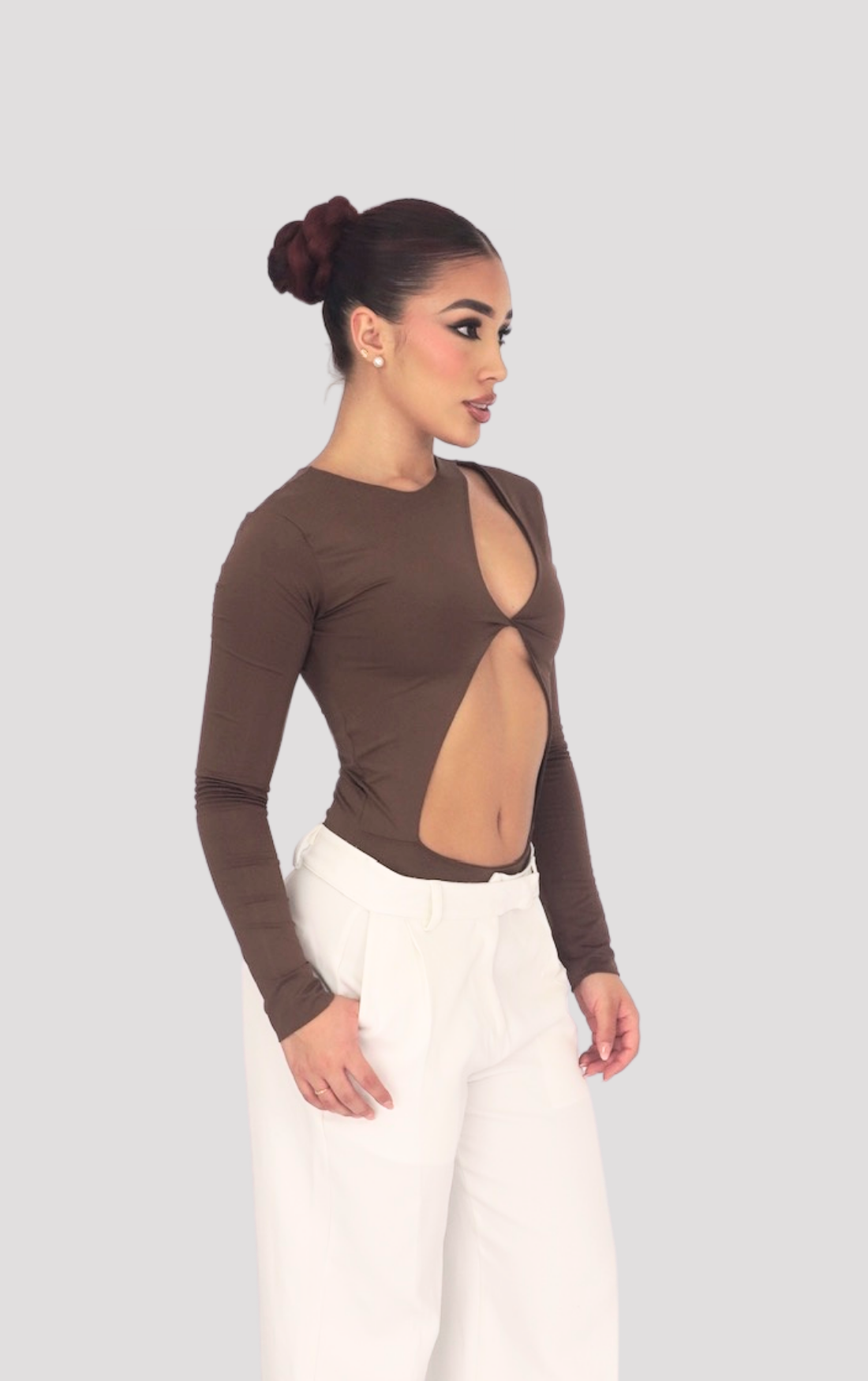 Confeccionado con manga larga y escote redondo cerrado al frente, su diseño se destaca por un cut-out en forma orgánica que revela el torso desde el busto hasta el abdomen, enmarcando la silueta de forma artística y sugerente. Esta abertura central se une con un delicado fruncido que aporta textura y dinamismo, manteniendo el diseño firme y favorecedor.