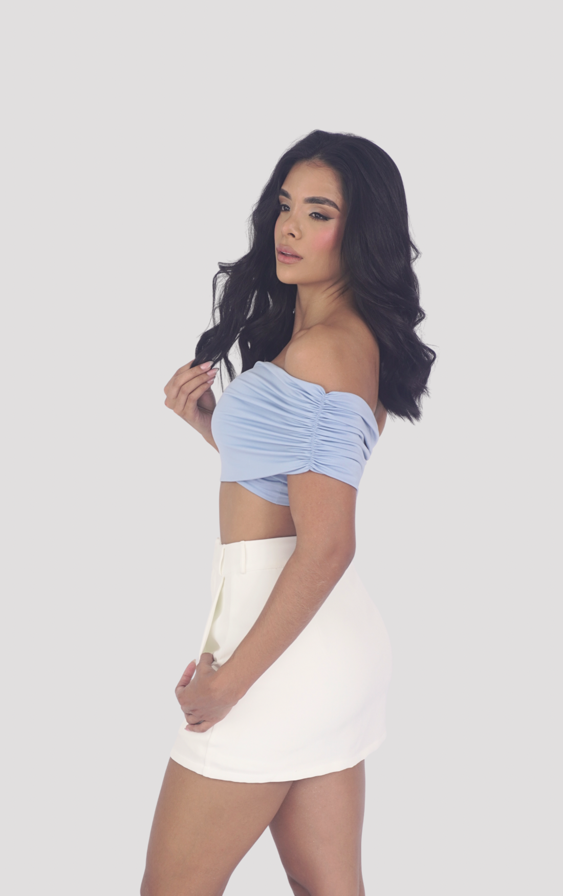El Top Perla es una joya veraniega que envuelve el cuerpo con suavidad y estilo. Su diseño off-shoulder con fruncido lateral aporta un toque delicado, coqueto y romántico, mientras deja al descubierto los hombros para un look fresco y femenino.