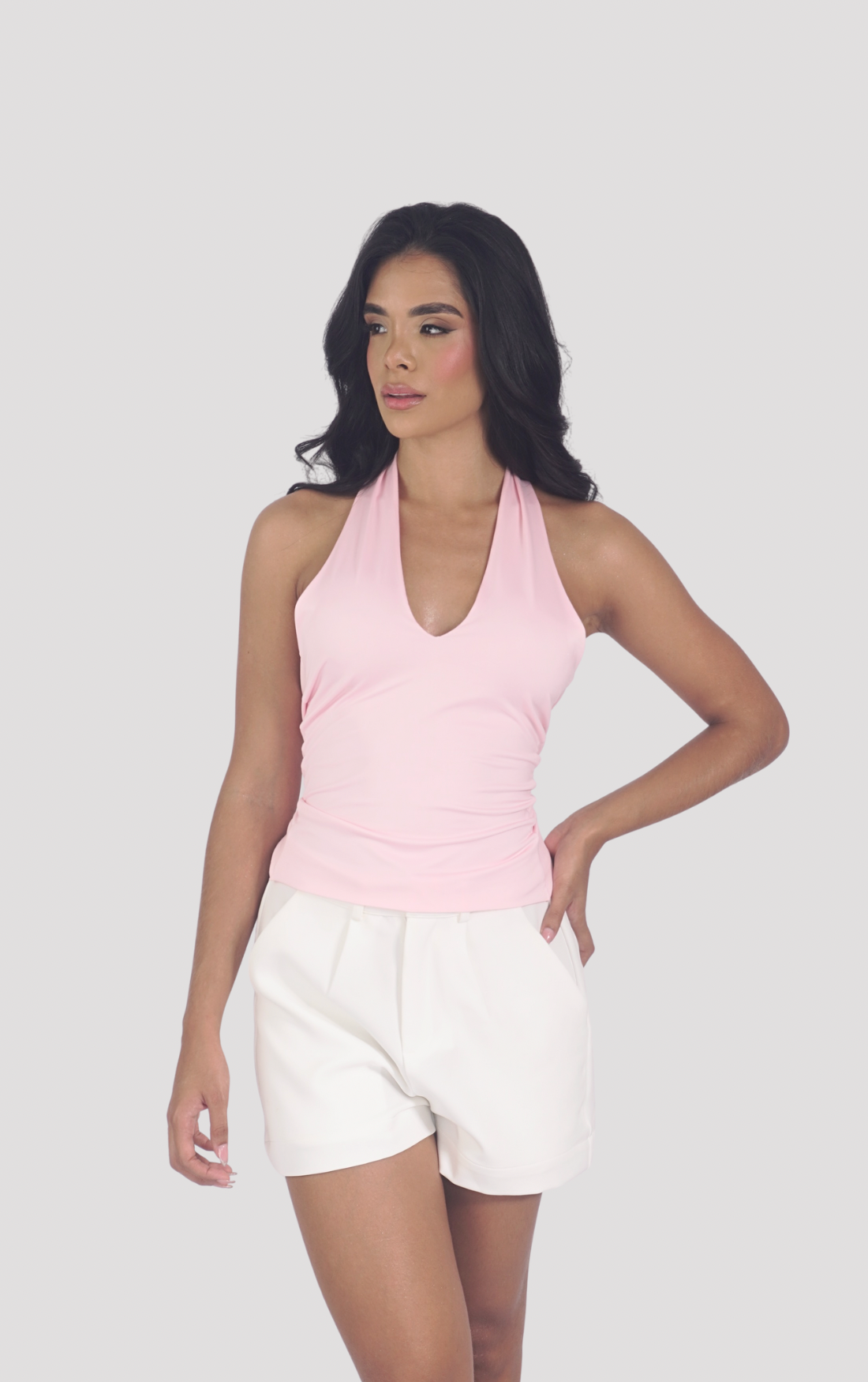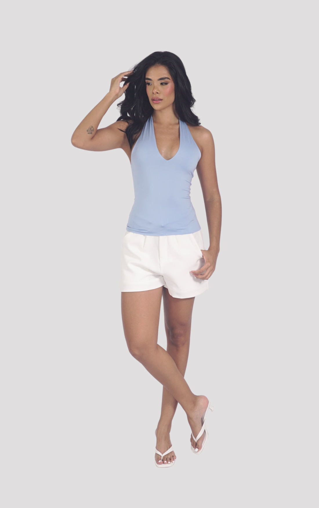 El Top Zafira es la combinación perfecta entre sensualidad y elegancia. Con un diseño halter de escote profundo y espalda totalmente descubierta, esta prenda abraza la figura con un toque sofisticado y fresco. Su construcción cruzada en la parte baja de la espalda crea un efecto visual armónico que estiliza la silueta.