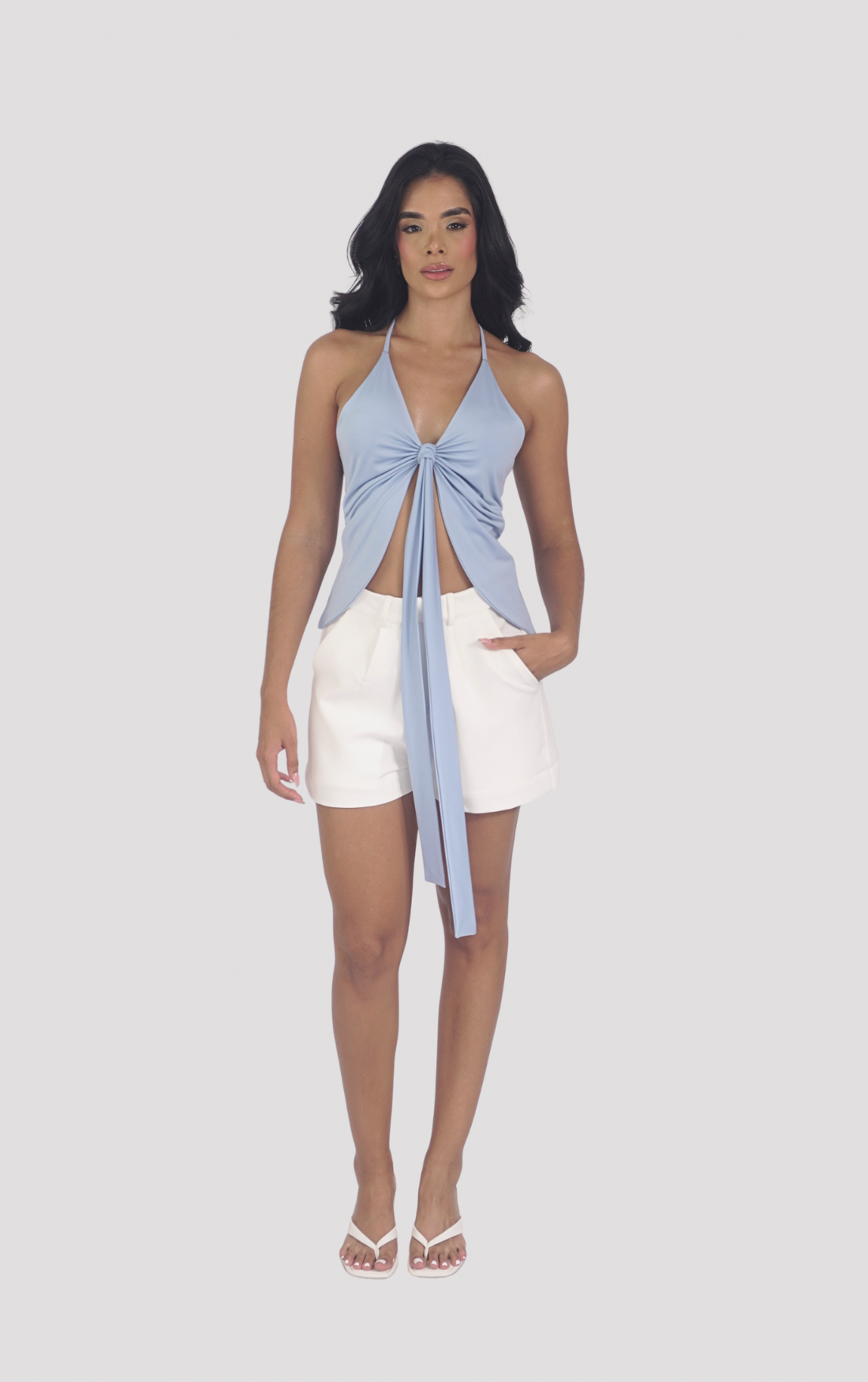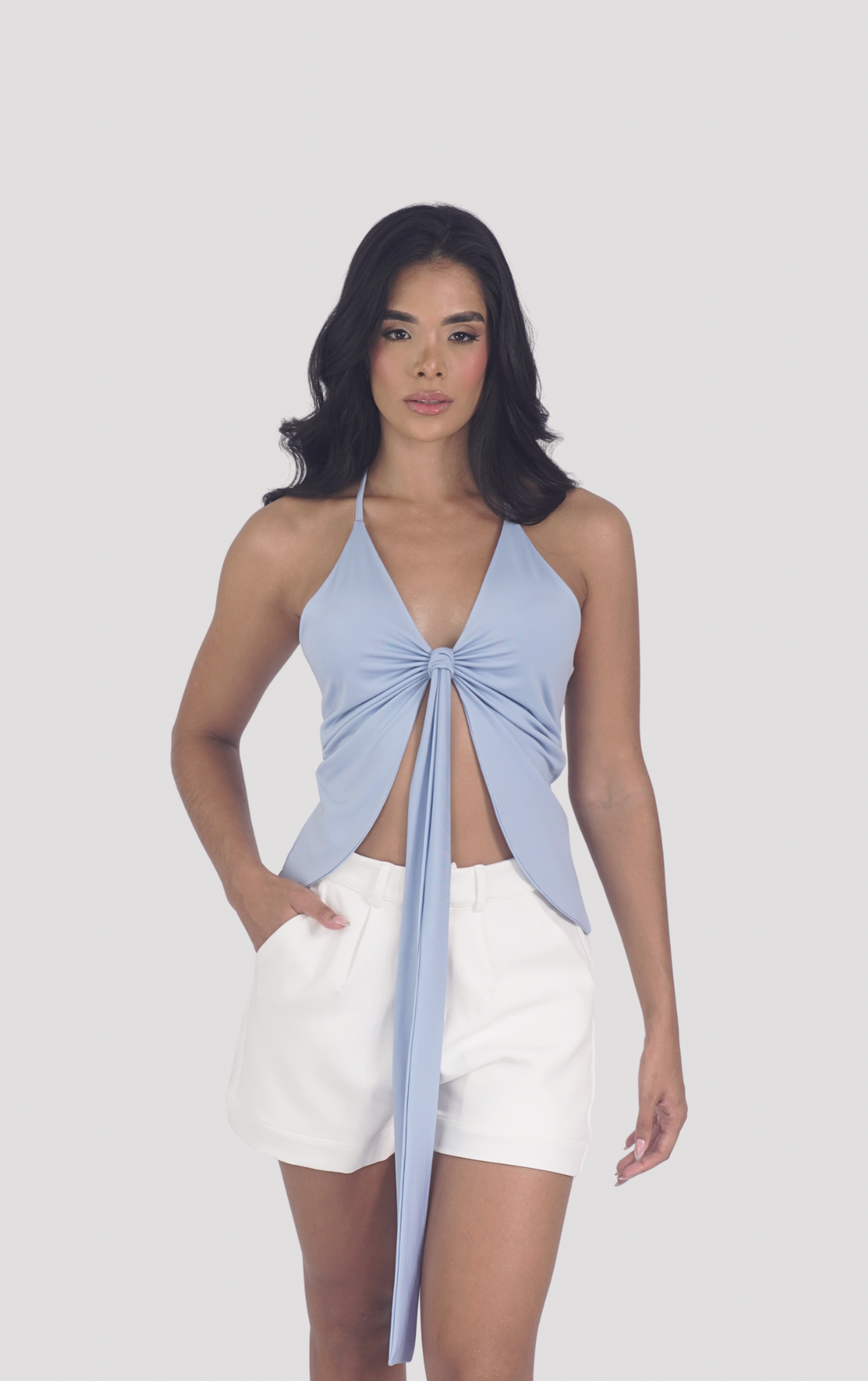 El Top Coralina es esa pieza fluida y femenina que le da vida a cualquier look. Con escote halter profundo, abertura central y caída tipo pañuelo, este diseño evoca la frescura del mar y el movimiento natural del viento tropical.