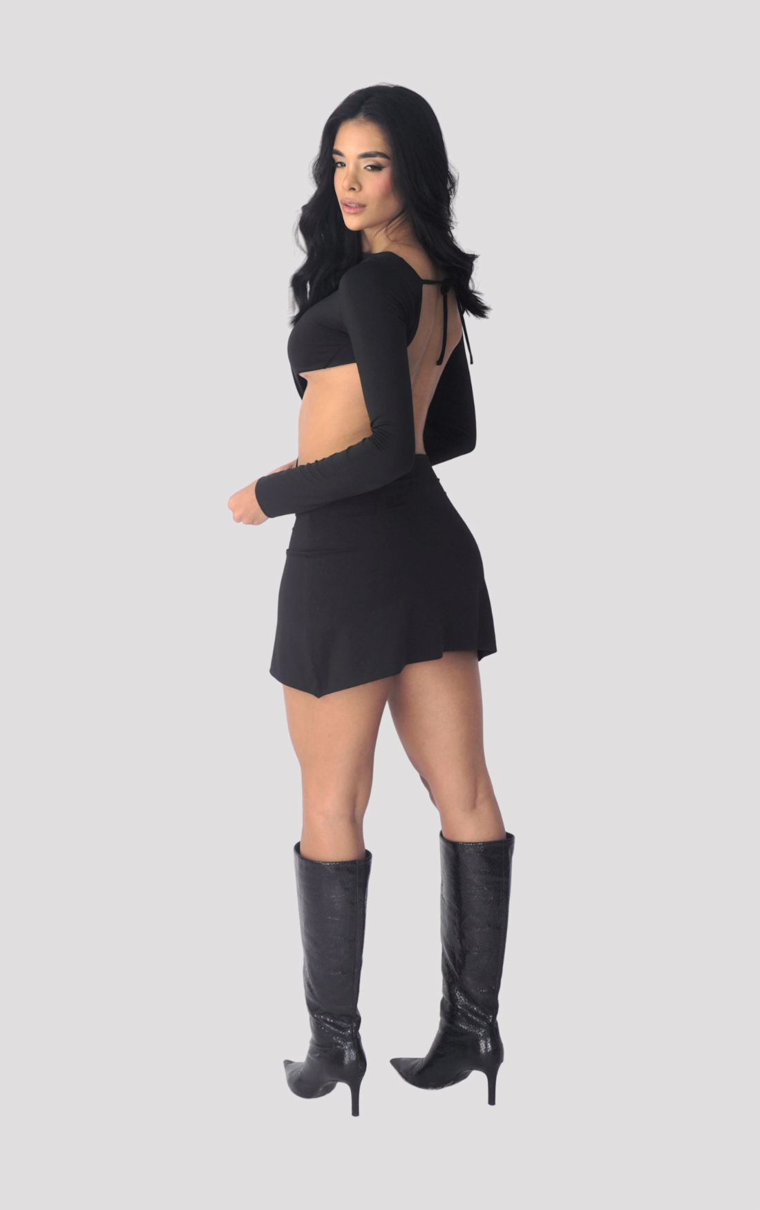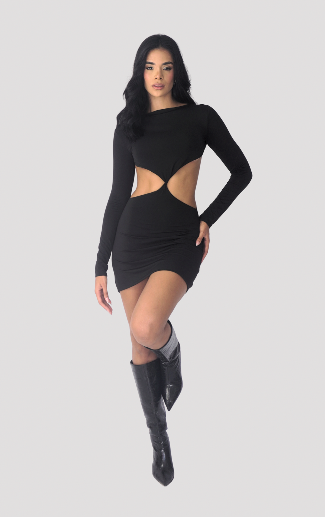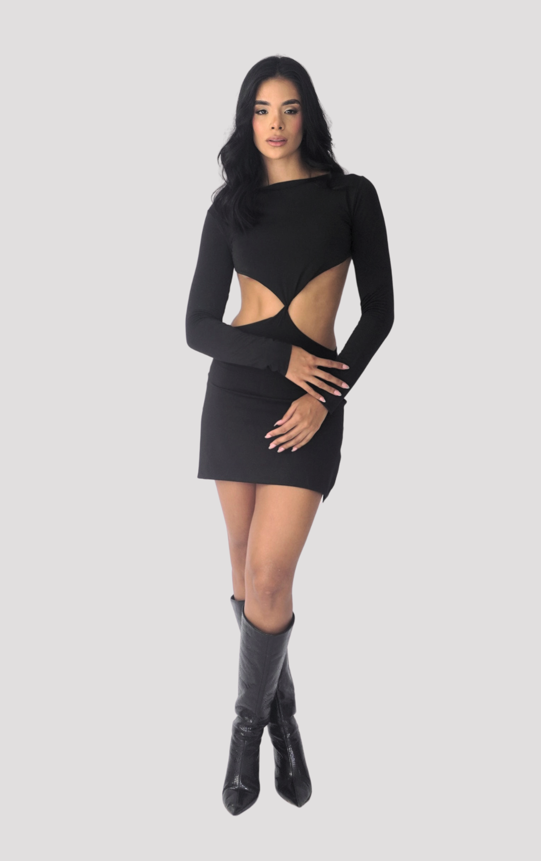 - Diseño: Vestido corto de manga larga con aberturas frontales que realzan la cintura y abren paso a un look moderno y atrevido.